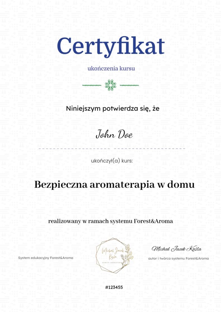 Kurs online realizowany na platformie edukacyjnej Forest&Aroma. Materiały obejmują lekcje wideo, pliki PDF do pobrania, ćwiczenia, quizy oraz materiały warsztatowe dostępne po zalogowaniu.